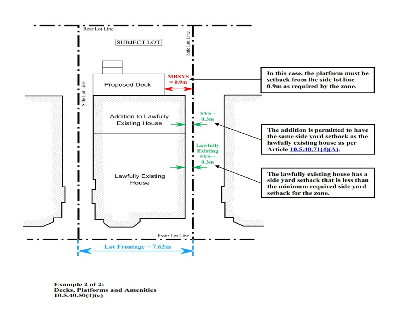 • This means a deck or porch cannot extend into a side yard, front yard, or rear yard beyond what the zoning by-law allows for the main building itself.
