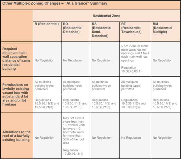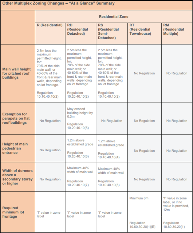 Toronto’s multiplex zoning regulations have recently undergone several updates impacting the design and construction of residential buildings in different zones. Each zone R, RD, RS, RT, and RM, has specific rules that influence how multiplexes can be developed, from main wall heights and dormer widths to parapet allowances and minimum lot frontages. This “At a Glance” summary condenses the essential zoning changes, offering developers, architects, and property owners a concise overview of the city’s intricate residential zoning framework.