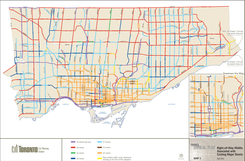 Identifying the exact locations impacted by this policy shift involves consulting specific city planning maps. “Major Streets” carry a defined meaning within Toronto’s Official Plan framework and are clearly marked on documents like Map 3 – Right-of-Way Widths Associated with Existing Major Streets, and related Policy Area Overlay Maps.